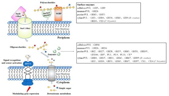 Attaching to the polysaccharides creates proximity for the microbe to the substrate, which enables cooperation between the enzymes and the microbes. This is because the destructed sugars are rapidly assimilated by the cell, alleviating the product-induced feedback inhibition of enzymes. Microbes with such a binding feature include members of Bacteroidetes, which encode CAZymes with type II signal peptides, allowing the enzymes to attach to the outside of the cell membrane. Interestingly, many of these enzymes have carbohydrate-binding modules (CBMs) or other polysaccharide-binding domains, enabling them to bind to specific polysaccharides [22]. The Bacteroidetes constitute a dominant phylum in the intestinal tract of humans and livestock animals and these bacteria metabolize a broad scope of dietary and host-derived polysaccharides, including the relatively simple glycans (such as starch [23], levan [24], and inulin) as well as cellulose and complex hemicellulose polysaccharides (like xylan [25,26,27], arabinan [28], galactan [29], arabinogalactan [30], xyloglucan [31,32], and galactomannans [33]). Their genomes typically contain abundant GHs and PLs corresponding to the varying types of polysaccharides [22,34]. The recently reported Bacteroides cellulosilyticus WH2 encodes 503 CAZymes comprising 373 GHs, 23 PLs, 28 CEs, and 84 glycosyltransferases [35]. Of special note is the fact that the CAZyme-encoding genes are typically co-localized within the genome at certain polysaccharide utilization loci (PULs), which was first presented by Bjursell et al. [36] to describe clusters of co-localized and likely co-regulated genes. The products of these genes orchestrate in regulating, sensing, recognizing, binding, enzymatic digestion, and transporting of (degraded) complex polysaccharide substrates into periplasmic space and cytosol [22,37,38,39] (Figure 1).