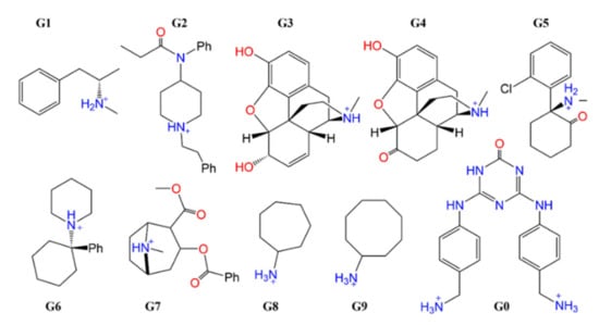 They were manually positioned inside the CB[8] receptor structure. These are the co-crystallized ligand 1,3-bis(4-aminomethylphenly)triazene (G0), methamphetamine hydrochloride (G1), fentanyl citrate (G2), morphine hydrochloride (G3), hydromorphine hydrochloride (G4), ketamine hydrochloride (G5), phencyclidine hydrochloride (G6), cocaine hydrochloride (G7), cycloheptanamine hydrochloride (G8), and cyclooctanamine hydrochloride (G9). We also invested the possibility of chiral discrimination by the receptor; for example, the difference in Gibbs free energy of binding of R- and S-enantiomers of G5 to CB[8] was below 1 kcal/mol and not further considered.