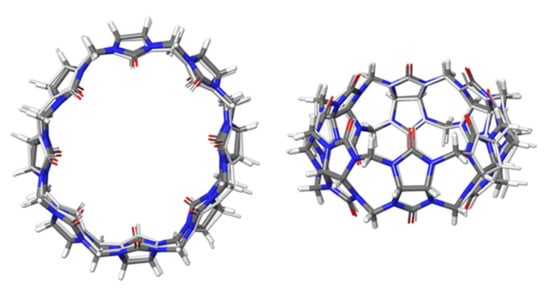 - Kim, J.; Jung, I.-S.; Kim, S.-Y.; Lee, E.; Kang, J.-K.; Sakamoto, S.; Yamaguchi, K.; Kim, K. New cucurbituril homologues: Syntheses, isolation, characterization, and X-ray crystal structures of cucurbit[n]uril (n = 5, 7, and 8). J. Am. Chem. Soc. 2000, 122, 540–541. [Google Scholar] [CrossRef]