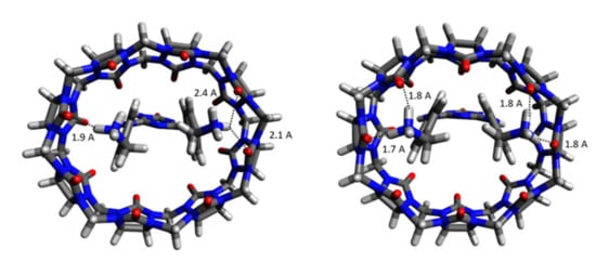 In order to assess the performance of those approaches, Statistical Assessment of Modeling of Proteins and Ligands (SAMPL) blind prediction challenges were initiated to address various aspects of predictions of properties related to drug discovery [,,,]. Since 2008, those SAMPL competitions have addressed the accurate modeling of protein-ligand complexes, but also small molecule properties such as hydration energies and the binding thermodynamics of host-guest systems. The most recent SAMPL8 was calling for predictions of ‘drugs of abuse’ binding to a synthetic receptor, including morphine, hydromorphine, methamphetamine, cocaine, and others. Cucurbit[n]urils, CB[n], are macrocyclic synthetic receptors and constructed by glycoluril groups, which are connected by [n] units of methylene bridges []. Due to their high binding constants and non-toxic nature, they are very good candidates for biological applications []. CB[8] is the largest member of this family. It has a cavity diameter of 8.8 Å and a cavity volume of 479 Å3 (see Figure 1) []. These features make CB[8] a very good candidate not only for 1:1, but also for possibly 1:2 host-guest complexation []. Binding constants Ka in the range of 104–1012 M−1 of several CB[n] complexes (with CB[6], CB[7] and CB[8] as hosts) were measured by monitoring 1H-NMR spectra at neutral pH [].