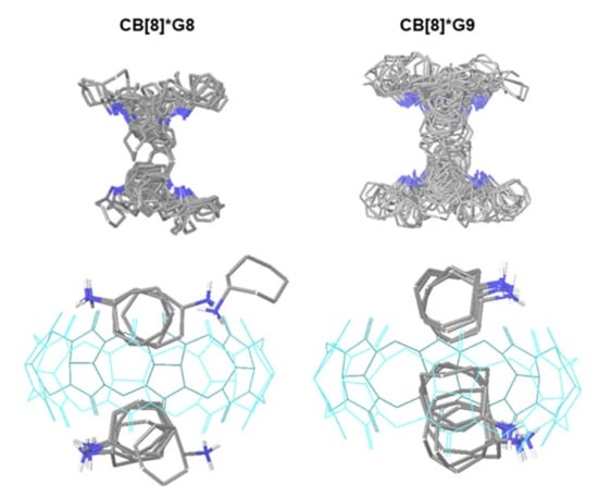 Figure 5 displays an overlay of the unique entries in the ligand-receptor CREs. Due to the symmetry of the host, the G8 and G9 ligands can access the CB[8] receptor from above and below the cage. Both binding modes are fully recovered during the sampling. In the lower part of Figure 5, the top-ranked 10 binding poses of the ensembles are shown. This gives an indication of the extent of variability of ligand binding modes to the receptor in a narrow energy window of 6 kcal/mol. The alkyl ring of the ligands is mainly pointing towards the inner side of the receptor where weak hydrophobic interactions are dominating. The positively charged amine groups, on the other hand, are mostly directed towards the carbonyl groups of the CB[8] receptor to form hydrogen bonds.