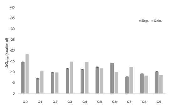 Calculated Gibbs free energies of binding of top-ranked ligands G0-G9 (in kcal/mol) to the CB[8] receptor in comparison to experiment.