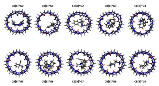 Structures of the top-ranked CB[8]*G0–G9 receptor-ligand complexes.