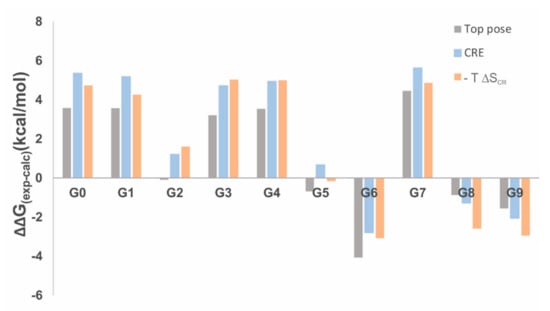Deviations of GFN2-xTB CREST results from experiment in kcal/mol for ligands G0 to G9 binding to CB[8]. Grey: Gibbs free energy of binding for top pose only; blue: For all members of the CRE; orange: Taking into account changes in conformational and rotational entropy of the ensemble (−TΔSCR).