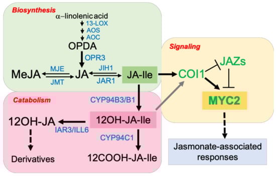 Overview of the jasmonate (JA) pathway including the major molecular players involved in biosynthesis, signaling, and catabolism. Black, blue, and green fonts show the main metabolites, enzymes, and proteins, respectively, for each section of the pathway. Scheme made based on [,,]. For more details, see the text.