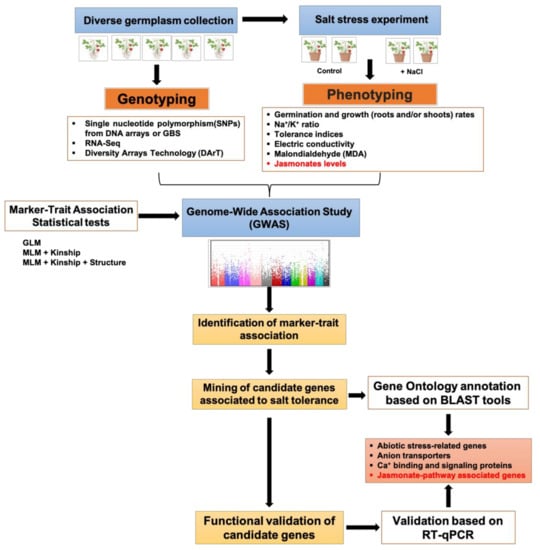 GWAS and QTL mapping have been implemented to identify the genetic factors involved in both osmotic and ionic components of salinity stress. A typical GWAS workflow to identify genes related to salt stress (and genes conferring salt tolerance) in crops is represented in Figure 2. Four main steps can be distinguished: (1) plant genotyping; (2) plant phenotyping based on morphological and physiological traits related to salt stress; (3) identification of marker–trait associations (MTAs); and (4) identification of candidate genes involved in the salt stress response. A diverse panel is genotyped using DNA markers, i.e., single nucleotide polymorphisms (SNPs), diversity arrays technology (DArT), or RNA-sequencing (RNA-seq) for the identification of genetic variants that affect the gene expression level in a specific tissue. Parallelly, this panel is phenotyped for different traits regarding the objectives of the study. In the context of salt stress in plants, the phenotyping is generally carried out considering several morphological and physiological traits, such as leaf area, root and shoot dry weight, seed germination rate, salt stress index (SSI), Na+/K+ ratio, chlorophyll content, and MDA, and, remarkably, changes in the phytohormone levels such as JAs. Particularly, these traits are evaluated in plants or seedlings that have been subjected to salt treatment. Subsequently, the genotypic and phenotypic data are combined to associate alleles with particular traits using classical GWAS models, which significantly detect molecular markers associated with the studied traits. Posteriorly, the MTAs can serve as a starting point for the mining of candidate genes. Gene Ontology (GO) annotation of the putative candidate genes can be carried out using BLAST tools.