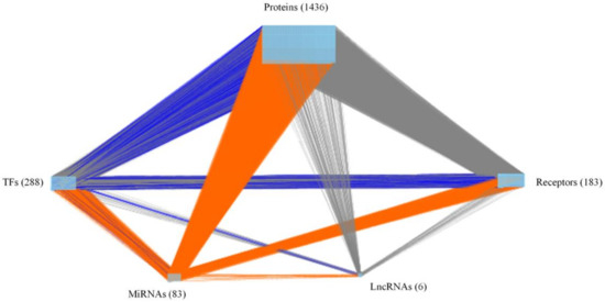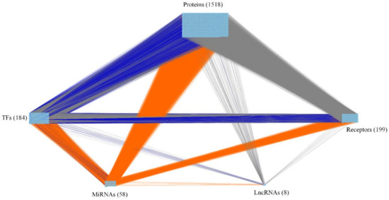 The core genome-wide genetic and epigenetic network (GWGEN) of TNBC. The grey lines indicate protein–protein interactions (PPIs); the blue lines denote transcriptional regulations by TFs and lncRNAs; and the orange lines represent post-transcriptional regulations by miRNAs. The numbers of receptors, proteins, TFs, miRNAs, and lncRNAs are 183, 1436, 288, 83, and 6, respectively.