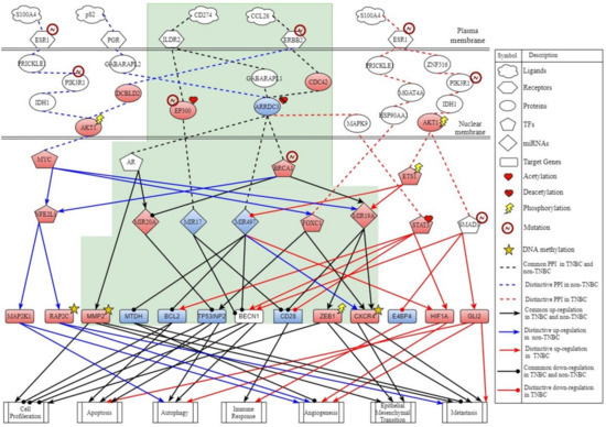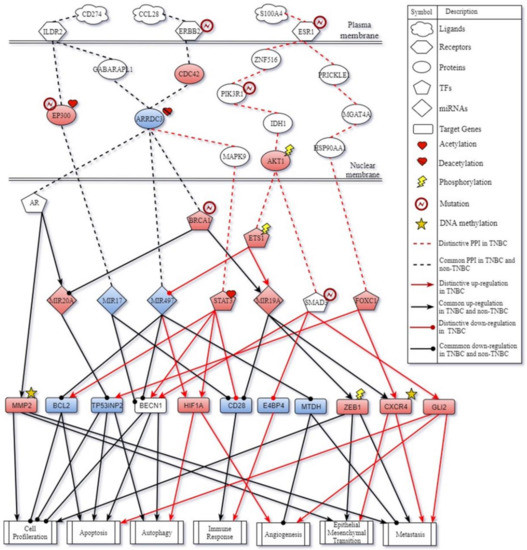 Based on the projection values obtained from the PNP method, we investigated the common core signaling pathways between TNBC and non-TNBC shown in Figure 5 with black lines. The receptor ILDR2 received microenvironment factor CD274, known as PD-L1 (a regulation signaling of the immune response), to silence miRNA MIR17 through signaling transduction protein EP300 in TNBC and non-TNBC. The mutative protein EP300 in breast cancer, which was affected by acetylation, could promote the transmission of upstream signals to its downstream regulator. MiRNA MIR17 with low expression could negatively regulate target genes BECN1 and CD28 to promote the proliferation of cancer cells and inhibit autophagy, apoptosis, and the immune response. Moreover, receptor ILDR2 also regulated TF AR, TF BRCA1, and miRNA MIR497 via signaling transduction proteins GABAPAL1 and ARRDC3. Suppression of ARRDC3 expression in breast cancer cells involving the epigenetic silencing caused by the deacetylases directly impacted signaling to downstream TFs. TF AR not only activated target gene MMP2, which was modified by DNA methylation, to trigger cell proliferation, epithelial-mesenchymal transition (EMT), and metastasis, but also transmitted the signal from protein ARRDC3 to miRNA MIR20A. Mir20A silenced target gene TP53INP2 to inhibit autophagy, apoptosis, and promotes cell proliferation. MiRNA MIR497 with low expression silenced target genes BECN1, MTDH, and BCL2 to indulge cancer cell differentiation, angiogenesis, and metastasis.