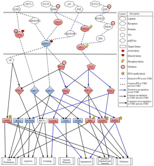 In the core signaling pathways of non-TNBC, shown in Figure 4 with blue lines, ligand CCL28 binding to receptor ERBB2 and ligand S100A4 binding to ESR1 could transmit signaling through proteins DCBLD2, PRICKLE1, PIK3R1, IDH1, and AKT1 to upregulate the same TF MYC. The aberrant activation of receptor ERBB2 in human cancers promotes tumorigenesis through the stimulation of AKT signaling [36]. The overexpression of protein DCBLD2 modified by phosphorylation not only increases the expression level of AKT1, but also makes AKT1 modify by phosphorylation. This phenomenon activates TF MYC to interact with miRNA MIR19A and TFs NFE2L1 and FOXC1, regulating their corresponding target genes to trigger several carcinogenic molecular mechanisms, including autophagy, apoptosis, cell proliferation, angiogenesis, EMT, metastasis, and the inhibition of the immune response.