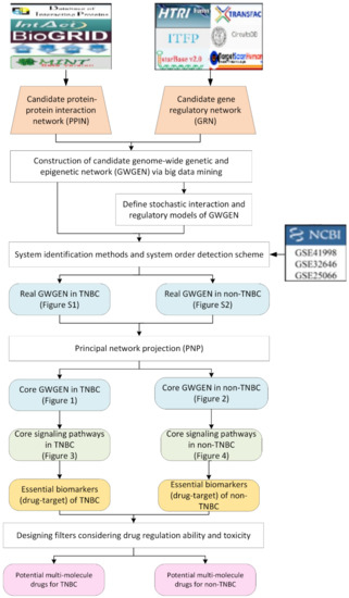 To find the essential biomarkers based on carcinogenic molecular mechanisms and propose potential multi-molecule drugs for TNBC and non-TNBC, a flowchart is given in Figure 6. In the viewpoint of the systems biology approaches, we could separate our systems medicine design procedure into five steps: (1) Using big database mining technique to construct a candidate GWGEN consisting of candidate PPIN and GRN; (2) Doing system modeling on proteins, genes, miRNAs, and lncRNAs; (3) Applying systems identification and systems order detection approaches assisting with the microarray data of TNBC and non-TNNC to obtain real GWGENs; (4) Applying the principal network projection method on the real GWGENs to get the core GWGENs and core signaling pathways denoted by KEGG pathways; (5) Designing filters of drug regulation ability and toxicity to obtain potential multi-molecule drugs. The detailed information of each step in Figure 6 are elucidated in the following section.