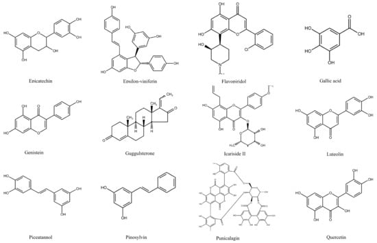 Chemical structures of all polyphenols discussed within this review. Aloe-emodin [29], Apigenin [30], Bestatin [31], Butein [32], Carnosic acid [33], Catechin [34], Chrysin [35], Curcumin [36], Delphinidin [37], Epigallocatechin gallate [38], Ellagic acid [39], Emodin [40], Epicatechin [41], Epsilon-viniferin [42], Flavopiridol [43], Gallic acid [44], Genistein [45], Guggulsterone [46], Icariside II [47], Luteolin [48], Piceatannol [49], Pinosylvin [50], Punicalagin [51], Quercetin [50], Resveratrol [52], Retinoic acid [53], Rhein [54], Silibinin [55], Cis-Stilbene [56], Trans-Stilbene [50], Tannic acid [57], Vitisin B [58], Xanthohumol [59].