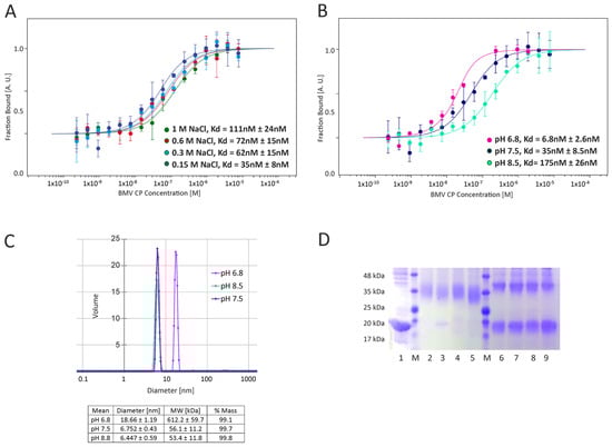 Earlier, it was shown that a decreasing pH is crucial for CP-CP interactions during VLP formation; however, the influence of ionic strength has not been taken into account. To assess the influence of both factors on the strength of the interaction between rCP and empty VLP assembly, we performed microscale thermophoresis (MST) assays. In the MST assay, a fluorescently labeled molecule (in our case rCP labelled with fluorescent marker) of constant concentration is titrated with a dilution series of the ligand (unlabeled rCP). The affinity between the proteins is assessed taking into account differences in a movement of the fluorescently labelled protein in a temperature gradient (thermophoresis) which is altered by any changes of the charge, size or hydration shell resulting from the ligand binding [23]. Two series of MST assays were performed: in Tris buffer at constant pH 7.5 with increasing salt concentration (150, 300, 600 and 1000 mM NaCl) and in Tris buffer at constant NaCl concentration of 150 mM and increasing pH (6.8, 7.5 and 8.5) (Figure 1A,B, respectively). The MST signals recorded for each measurement were plotted against rCP concentration to obtain dose-response curves, from which the Kd was evaluated. The rCP bound each other with a Kd in the nanomolar range at all tested conditions, which indicates a tight interaction. All the MST data collected clearly confirmed that both the pH and ionic strength significantly influence the interaction between rCPs. The Kd at pH 8.5 was 175 nM, that at pH 7.5 was 35 nM and that at pH 6.8 was 6.8 nM. At decreasing ionic strength, Kd reached 111 nM, 72 nM, 62 nM and 35 nM at 1000, 600, 300 and 150 mM NaCl, respectively. The influence of pH on the interaction between rCPs seems to be more significant than that of ionic strength, as illustrated by a two orders of magnitude higher range of Kd changes at pH gradient.