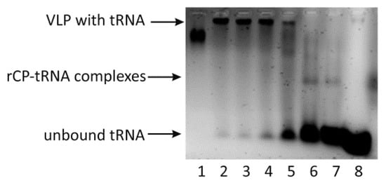 BMV-based VLPs formation according to various CP/tRNA mass ratios in native agarose gel electrophoresis. Lanes: 1—wt BMV, 2–7—various CP/tRNA mass ratios (from 6:1 to 1:1), 8—tRNA without CP. The arrows indicate formed VLP with tRNA inside, intermediate CP-tRNA complexes and the unbound tRNA.
