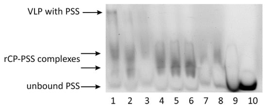 BMV-based VLPs formation according to various CP/PSS mass ratios in native agarose gel electrophoresis. Lanes: 1 to 8—various PSS/CP mass ratios (from 1:8 to 1:1). Lane 9—PSS without protein. Lane 10—tRNA without protein. The arrows indicate formed VLP with PSS inside, intermediate CP-PSS complexes and the unbound PSS.
