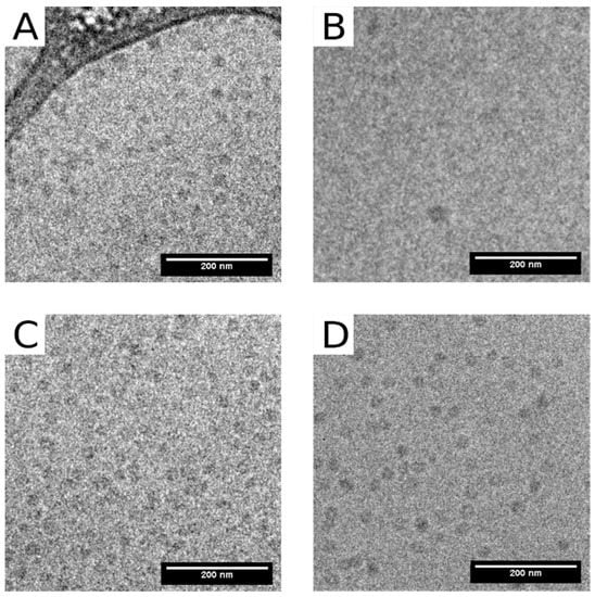 Cryo-TEM images of BMV-based VLPs. (A) Empty VLPs obtained from wt CP (eVLPs). (B) Empty VLPs obtained from mutated CP (eMVLPs). (C) VLPs obtained from wt CP with tRNA (tVLPs). (D) VLPs obtained from mutated CP with tRNA (tMVLPs).
