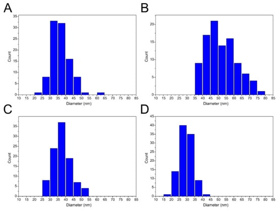 Size distribution of VLP populations from cryo-TEM images. (A) Empty VLPs obtained from wt CP (eVLPs). (B) Empty VLPs obtained from mutated CP (eMVLPs). (C) VLPs obtained from wt CP with tRNA (tVLPs). (D) VLPs obtained from mutated CP with tRNA (tMVLPs).