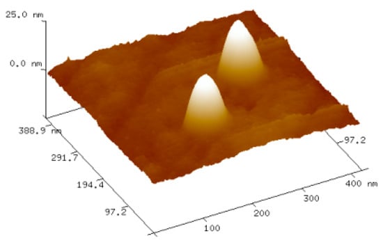 The empty VLP analyses also involved atomic force microscopy (AFM). Experiments performed in air revealed that empty VLPs stably retained their spherical structure and dimensions in a dry environment (Figure 6). The average diameter of VLPs was 32 nm and ranged from 16 to 63 nm.