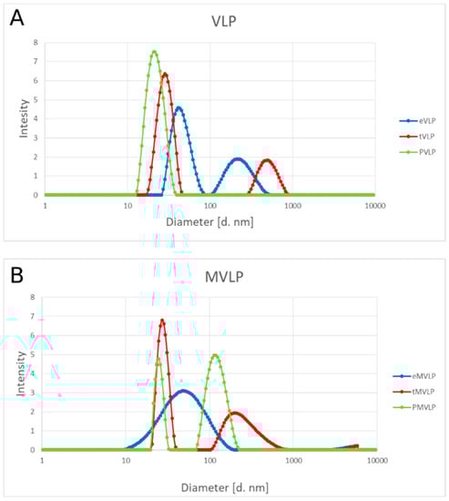 Consistent with the cryo-TEM results, DLS measurements also showed variations in hydrodynamic diameters both within and among the studied VLP populations (Figure 7). The eVLP population had the largest and most variable diameter, approximately 40 ± 10 nm. The diameter of tVLPs was approximately 28 nm ± 5 nm, and that of PVLPs was approximately 21 nm ± 5 nm.