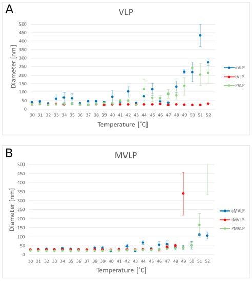 MVLPs also showed different stabilities than unmutated VLPs. The size of the eMVLPs varied within the whole range of temperatures applied in our experiment (from 19 to 85 nm). In the eMVLP sample, the amount of large aggregates (>100 nm) was significantly increased at 51 °C. We also observed that tMVLPs were not as stable as their tVLP analogs. At 46 °C, the size of tMVLPs was approximately 27–31 nm, but at higher temperatures, larger aggregates appeared. At 49 °C, a majority of tMVLPs were >300 nm. PMVLPs were smaller than other MVLPs until the temperature reached 41 °C. From 42 °C, the average size of the PMVLPs increased. At 51 °C and above, the majority of PMVLPs were >100 nm.