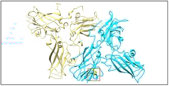 Computational model of two wild-type BMV capsid protein trimers. One trimer in yellow, second in cyan. The red square shows the place of interaction between two amino acid residues on two neighboring chains—the target for our mutation.