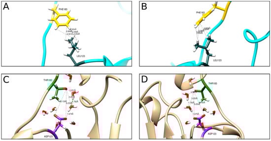 Computational model of a fragment of the BMV capsid protein. (A,B) depict wild-type virus hydrophobic interactions of two interacting amino acid residues on two neighboring chains. Leu123 in slate gray, Phe183 in yellow, rest of the protein in cyan. Black dashed lines show distances (in Å) between residues involved in hydrophobic contacts. (C,D) depict the hydrogen bond interaction pattern between mutated residues. Asp123 is shown in magenta, Thr183 in green, and the rest of the protein in beige. The electrostatic interactions between residues are mediated by water molecules. Black dashed lines show electrostatic interactions between residues and residue/water molecules.