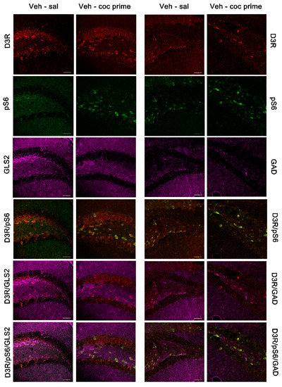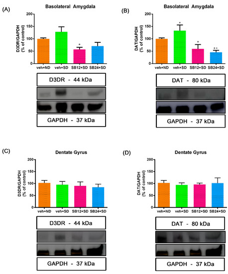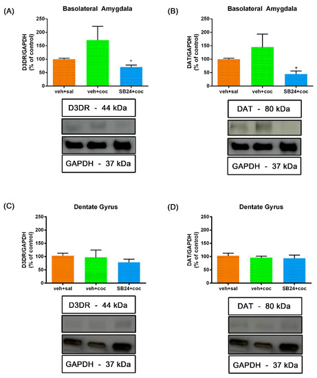 2.2. The Administration of SB-277011-A Prior Drug Prime and Social Stress Altered D3R and DAT Expression in the BLA but Not in the Hippocampal DG