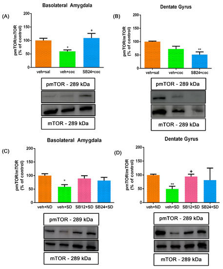 2.3. The Reinstatement of Cocaine CPP Induced by Both a Drug Prime and Social Stress Decreased mTOR Phosphorylation Ratio in BLA and DG