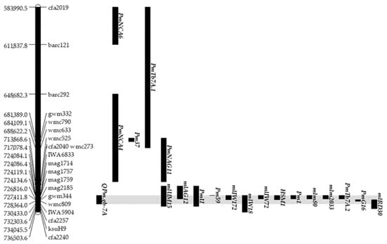 - Nine additional resistance loci showed a co-positional relationship of physical region with QPm.gb-7A: Pm59 (from 724.0 to 724.1Mbp), mlIW172 (from 724.1 to 727.4 Mbp), Pm1, mlIW72, mlm80, PmTb7A.2 and mlm2033.(from 724.1 to 726.8), HSM1 (from 724.1 to 727.4 Mbp), and PmG16 (from 727.4 to 728.3 Mbp) [40,48,49,50,51,52,53,54,55].