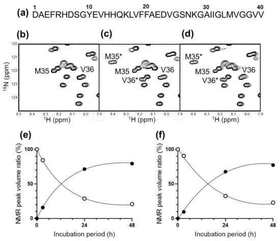 We first examined the possible effects of CAP irradiation on Aβ (1–40) structure. The Aβ (1–40) solution was irradiated with moistened helium gas for 10 s using a plasma source (Figure 1). The structural changes before and after plasma irradiation were tracked using 1H–15N heteronuclear single-quantum correlation (HSQC) peaks as spectroscopic probes (Figure 2 and Supplementary Materials Figure S1). Although no significant spectral change was observed immediately after CAP irradiation, the peaks originating from the segment from Ile32 to Val39, especially those from Met35 and Val36, gradually exhibited significant chemical shift changes after incubation at 37 °C (i.e., from Met35 to Met35* and from Val36 to Val36*) (Figure 2c). The magnitudes in the spectral changes gradually reached a saturation point after the CAP irradiation and did not return to the original peak position (Figure 2c,e).