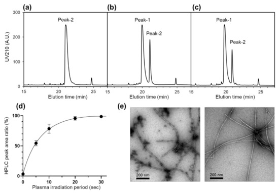 HPLC profiles of (a) Aβ (1–40) without CAP treatment, (b) Aβ (1–40) with 10 s CAP treatment, and (c) Aβ (1–40) dissolved into the buffer solution pretreated with CAP. (d) Changes in the HPLC peak area ratio of peak-1 to peak-2 depending on the period of CAP irradiation. Each ratio value is the mean ± SD of three values. (e) TEM images of amyloid fibrils prepared by Aβ (1–40) in peak-1 (left panel) and in peak-2 (right panel) fractions.
