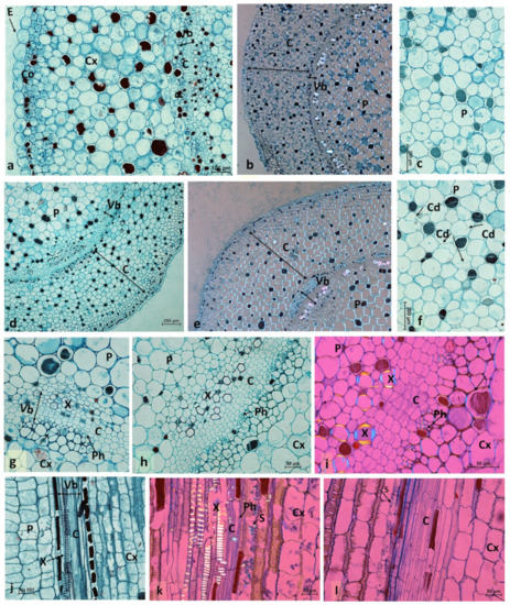 The stem surface of the control plants was covered by large epidermal cells (E) and several layers of collenchyma cells (Cx) (Figure 2a). Both cortex and pith consisted of large, vacuolated collenchymatous cells, whose cell walls glowed in the polarized light microscopy image (LMP) (Figure 2a–c). In B. calycinum, vascular tissue was found at the border between cortex and pith. Cambium formed a ring consisting of 2–3 cell layers surrounded by a cluster of phloem elements from the side of cortex and a cluster of xylem elements from the side of pith (Figure 2b,g).