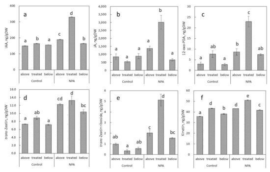 Effect of NPA (0.4%, w/w in lanolin) on endogenous levels of IAA (a), jasmonic acid (JA) (b), 12-oxo-phytodienoic acid (12-oxo-PDA) (c), trans-zeatin (d), trans-zeatin riboside (e), and kinetin (f) in 4–5-mm pieces of internode at the NPA treatment site, and areas above and below in B. calycinum. Treated, above and below in the figure indicate plant hormone levels at, above and below areas of the treatment, respectively. Values are means with standard errors (n = 3). Different letters indicate statistical differences in Duncan’s multiple range test at p < 0.05 after analysis of variance (ANOVA).