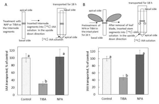Effect of NPA and TIBA on polar auxin transport in stem segments of B. calycinum. (A): Internode segments (25 mm in length) were prepared, and then, lanolin with or without NPA (0.4%, w/w in lanolin) or TIBA (0.4%, w/w in lanolin) was applied to the middle of the internode. (B): Internode segments (40 mm in length) were prepared from intact stems pretreated with TIBA or NPA for 24 h prior to the experiment. Internode segments treated only with lanolin served as control segments. After removing leaf blade, the stem segments were placed into vials facing down the apical side. Polar auxin transport was assessed by radioactivity of [14C]-IAA transported from the apical to the basal end of the stem segments for 18 h. The results were expressed as percentages of control values. Vertical lines represent SE of the mean (n = 3). Different letters indicate statistical difference in Student’s t-test at p < 0.05 after ANOVA.