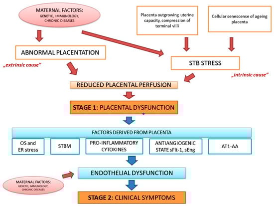 In 2014, Redman and in 2019, Staff published an update to the two-stage model of PE. The most important finding is that there are at least two (potentially more) different pathways leading to stage 1: It is not only poor placentation with inadequate remodeling of maternal spiral arteries, but also intraplacental malperfusion due to mechanical restrictions causing syncytiotrophoblast (STB) stress. The first pathway reflects an “extrinsic cause” of placental dysfunction developing early in pregnancy and leading to early-onset PE accompanied very often by FGR. The second pathway depicts the situation when late in pregnancy the placenta outgrows uterine capacity and terminal villi are compressed impeding intervillous perfusion. This is called an “intrinsic cause” of placental dysfunction and is related to late-onset PE with normal fetal growth [,]. There is also another pathway that can lead to STB stress–a cellular senescence of ageing placenta. Upregulation of senescence factors (e.g., annexins) in preeclamptic placentas, as well as the shortening of telomere in placental cells during PE indicate the link between cellular senescence and PE [].