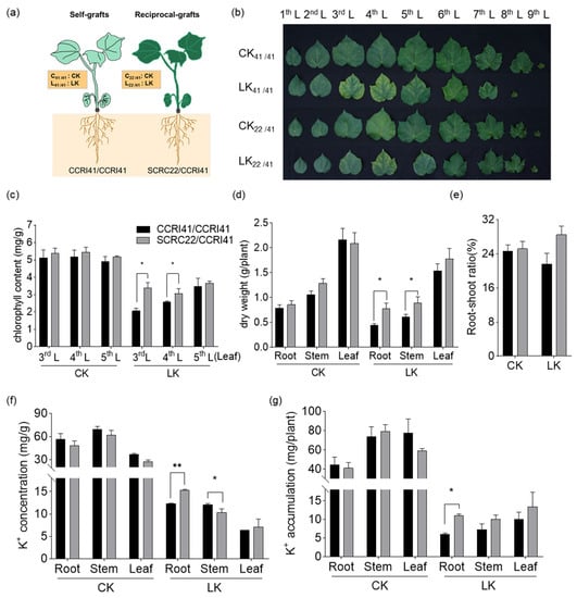 Effects of potassium (K+) deficiency on CCRI41 (a K+ inefficient cotton variety) self-grafts (CCRI41/CCRI41, scion/rootstock) and its reciprocal grafts (SCRC22/CCRI41) with SCRC22 (a K+ efficient variety). Grafting was performed hypocotyl-to-hypocotyl (a) when the cotyledons of rootstock just fully expanded. Grafts were subjected to low K+ (LK, 0.03 mM K+) at the three-leaf stage, with 2.5 mM K+ as control (CK). After 16 days, all leaves were photographed (b), and the chlorophyll content in the third (3rd L), fourth (4th L) and fifth (5th L) leaves was measured (c). The dry weight of roots, stem and leaves was recorded (d), and the root-shoot ratio was calculated (e). K+ concentration (f) and K+ accumulation (g) in roots, stem and leaves were determined or calculated. CK: Control; LK: Low K+ treatment. The data are shown as means ± SD of three replicates (n = 3); * and ** indicate significant differences at 5% and 1% level, respectively.