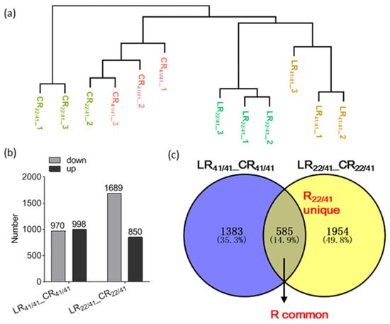 Transcriptome relationships among the roots of CCRI41 self-grafts (CCRI41/CCRI41, scion/rootstock) and reciprocal grafts (SCRC22/CCRI41) under potassium (K+) deficiency. (a) Cluster dendrogram of the root transcriptomes. (b) Number of differentially expressed genes (DEGs) in the roots of CCRI41/CCRI41 and SCRC22/CCRI41. (c) Venn diagram showing shared and unique DEGs in both grafts. CR and LR: Roots from CK and LK-treated plants; 41/41: CCRI41/CCRI41; 22/41: SCRC22/CCRI41; 1, 2, and 3: Number of replicates. R common: Common DEGs in the roots of both grafts. R22/41 unique: The DEGs specifically identified in the roots of SCRC22/CCRI41.