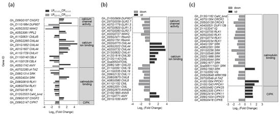 Three DEGs, including one annotated by Ca2+ channel activity (Gh_D11G1884), one related to Ca2+ binding (Gh_A05G1742) and one associated with CaM binding (Gh_A07G2285) were up-regulated in the roots of CCRI41/CCRI41 but down-regulated in the roots of SCRC22/CCRI41 (Figure 3a). Moreover, there were 55 Ca2+ related DEGs identified in SCRC22/CCRI41 alone. Among these, several related to Ca2+ and CaM binding, and GhCIPKs were up-regulated under low K+, which was notable compared with those numerous down-regulated DEGs related to Ca2+ signaling in R22/41 unique group (Figure 3b,c).