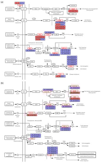 The 19 and 16 DEGs related to phytohormone were found in R common and R22/41 unique group, respectively (Figure 5). The similarly regulated (both up- or both down-) DEGs in both grafts were associated with auxin (one up-regulated GhSAUR gene), CTK (one down-regulated GhARR12 gene, and two up-regulated GhARR18 genes), ABA (one down-regulated GhSNRK2 gene, and one up-regulated GhPP2C8 gene), ethylene (five down-regulated genes, GhETR2, GhEBF1, two GhERF1B genes, and GhERF15A), and BR (five down-regulated GhTCH4 genes) (Figure 5a).