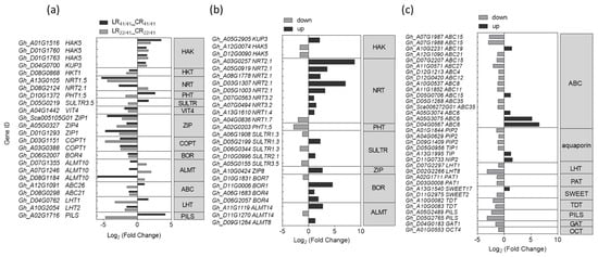 Besides K+ transporter genes, the expression level of other nutrients transporter genes altered in cotton roots exposed to K+ deficient surroundings. For example, one putative Na+ transporter gene, one NO3− transporter gene, one iron transporter gene, three zinc transporter genes, two copper transporter genes, and one boron transporter gene were all significantly down-regulated in the roots of CCRI41/CCRI41 and SCRC22/CCRI41 (Figure 6a). The overall nutrient demand is less or root to shoot translocation is reduced under low-K+ stress, which probably confers feedback inhibition of expression of related genes in roots [].