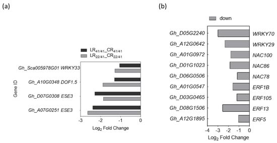 As GhHAK5 (Gh_D01G1760) is a marker gene induced by K+ deficiency [], the TF-binding sites were predicted from the putative promoter sequences (2 kb upstream from the transcriptional start site) of GhHAK5 gene aiming to identify its candidate TFs from differently expressed TFs. For the R common group, four down-regulated TFs (GhWRKY33, GhDOF1.5, and a pair of GhESE3) were predicted to modulate the expression of GhHAK5 (Figure 7a). For the R22/41 unique group, two WRKYs (GhWRKY29 and GhWRKY70), three NACs (GhNAC78, GhNAC86 and GhNAC100), and four ERFs (GhERF5, GhERF13, GhERF105, and GhERF1B) were predicted to be involved in the regulation of GhHAK5 (Figure 7b). These nine TFs were down-regulated under K+ deficiency (Figure 7b).