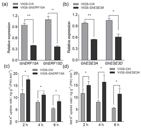 We investigated the function of GhERF15A and GhESE3A using virus-induced gene silencing (VIGS) assay in the variety of SCRC22. As shown in Figure 8a,b, a pair of GhERF15 (Gh_A08G1686 and Gh_D08G2044) and a pair of GhESE3 (Gh_A07G0251 and Gh_D07G0308) were effectively silenced, and their expression levels decreased by 62.4% and 42.7%, respectively. Seedlings with equal fresh weight were selected to determine the K+ uptake activity. As expected, VIGS-GhERF15 and VIGS-GhESE3 seedlings showed 38.0%–52.4% and 28.5%–105.8% higher net K+ uptake rate than VIGS-Ctrl plants (Figure 8c,d).