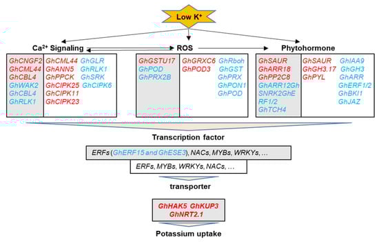 Plants have evolved complex signaling pathways to address the issue of fluctuating external K+ levels. Root cells could perceive external K+ deficiency and generate initial K+ signaling, and this K+ signaling is subsequently transduced or encoded by Ca2+ and reactive oxygen species (ROS) sensors, which then induce changes in signaling components, including phytohormones and transcription factors (TFs). Phytohormones and TFs then regulate the downstream (including K+ channels and transporters) transcriptional, translational, and posttranslational responses, and finally, plants exert many morphological and physiological adaptive changes that assist survival under K+-deficiency stress [,,].