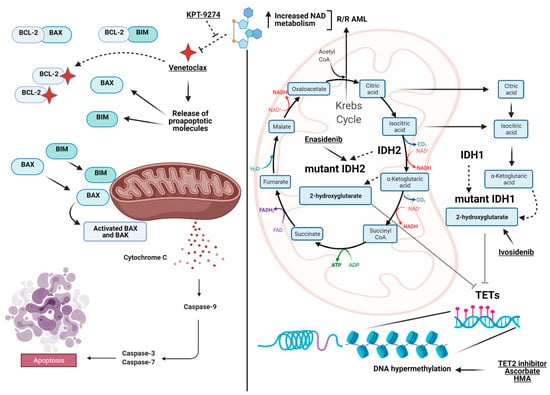 View at a glance of the landscape of the metabolic interactions between genes and pathways discussed in the manuscript. On the left, the intrinsic apoptotic pathway highlighted by BCL-2 as the pivotal player (targeted by Venetoclax) and the interaction with BAX and BIM to initiate the caspases cascade to trigger apoptosis. On the right, the interaction between the Krebs cycle (TCA), the convergence of IDH1/2 generating α-ketoglutarate, 2-hydroxyglutarate and the TET family of genes, which finally impacts DNA methylation. Included are also the available drugs used to target the depicted pathways. On the top, in relapsed/refractory (R/R) acute myeloid leukemia (AML), the interconnection between the increase in NAD metabolism generated by alteration of oxidative phosphorylation and Venetoclax resistance is shown together with proposed actionable target agents (e.g., KPT-9274) inhibiting Nicotinamide Phosphoribosyltransferase (NAMPT). Images were generated using BioRender.