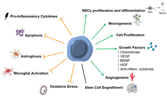 Mechanisms of action of stem cells identified by the preclinical studies included in this systematic review. Several mechanisms of action that might be mediating the positive functional outcomes observed after SCT in preclinical models of neonatal hypoxic-ischemic encephalopathy (HIE). Stem cell therapy (SCT) was associated with the promotion or upregulation (green arrows) of neuronal stem cells (NSCs) proliferation and differentiation, neurogenesis, cell proliferation, growth factors levels/secretion, angiogenesis, and inhibition or downregulation (orange truncated arrows) of pro-inflammatory cytokines, apoptosis, astrogliosis, microglial activation, and oxidative stress. Also, some studies report stem cell engrafment after SCT, while other report low or no engrafment. Abbreviations: Anti-inflam—anti-inflammatory; BDNF—brain-derived neurotrophic factor; HGF—hepatocyte growth factor; VEGF—vascular endothelial growth factor.