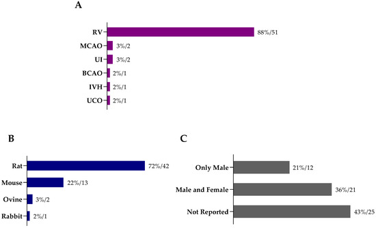 (A) Animal models used to induce hypoxic-ischemic encephalopathy in the studies included in this systematic review, as well as the employed (B) species and (C) animals’ sex across the different studies (percentage/number of reports). Abbreviations: BCAO—bilateral carotid artery occlusion; IVH—intraventricular hemorrhage; RV—Rice–Vannucci animal model (or adaptation); MCAO—middle cerebral artery occlusion; UCO—umbilical cord occlusion; UI—uterine ischemia.