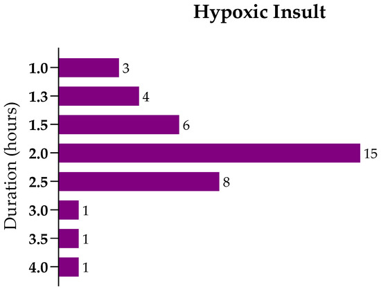One of the most widely used animal models for the assessment of hypoxic-ischemic brain damage in the neonatal brain is the Rice–Vannucci (RV) murine model [1,13]. The RV model was first described in postnatal day-seven (P7) rats, and the protocol consists of the unilateral permanent occlusion of the common carotid artery (CCA)—ischemia—followed by exposure to a variable period of reduced oxygen levels (usually 8%)—hypoxia. The degree of brain damage severity is highly dependent on both the duration of the hypoxic period [14] and the arteries occluded, since the ligation of both the common and external carotid arteries, instead of only CCA ligation, results in a larger and more consistent brain lesion [15]. Concerning the rodent age when the HI insult is inflicted, the majority of the studies use P7 rodents, which present a brain development equivalent to the human fetus at 32–34 weeks of gestation, while other use P10 rodents, which present a brain development equivalent to the human newborn at term [16].