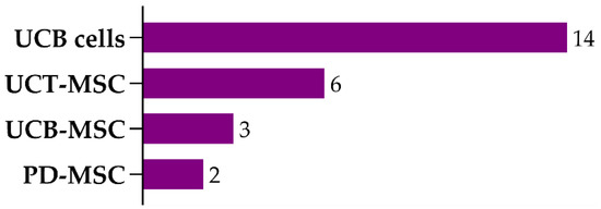Umbilical cord tissue-derived MSCs (UCT-MSCs) differ from MSCs isolated from the bone marrow (BM-MSCs) by the higher proliferative potential [105], lower expression levels of vascular endothelial growth factor (VEGF) [106,107,108], and other proangiogenic factors [107], higher expression levels of chemokines and angiogenic growth factors [109,110], and higher secretion of neurotrophic factors [111]. UCT-MSCs also present a higher immunomodulatory activity than MSCs from other sources [105,112].