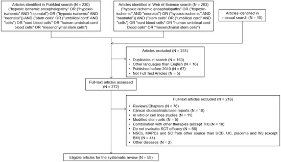 To address this concern, several adjuvant therapies to TH are currently being tested, such as erythropoietin, melatonin, topiramate, xenon, and stem cell therapy (SCT), among others [21]. In this systematic review, we will assess the potential of SCT for HIE, focusing on preclinical studies using stem cells isolated from the umbilical cord blood, umbilical cord tissue, placenta, and bone marrow.