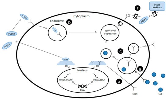 Mechanism of action of proprotein convertase subtilisin/kexin type 9 (PCSK-9) inhibitors. (A) Intracellularly produced low-density lipoprotein receptor (LDL-R) is transported to the cell membrane, where it is responsible for binding low-density lipoprotein (LDL) particles. (B) After LDL is attached to LDL-R, the complex is endocytosed and then broken down into substrates in the endosome. (C) The LDL molecule undergoes lysosomal degradation, and the LDL-R is transported back to the cell membrane. (D) At the same time, in other parts of the cell membrane, PCSK-9 binds with LDLR, which causes endocytosis of the complex thus formed and its subsequent degradation in the lysosome. (E) The use of PCSK9 inhibitors causes the binding of free PCSK-9 molecules, which prevents them from binding to LDL-R and subsequent receptor degradation. ER: endoplasmic reticulum.