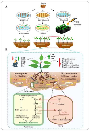 In the study of Sarkar et al. [57], the inoculation of rice seeds with Enterobacter sp. strain P23 promoted higher germination percentage (GP) (76% ± 7.03 vs. 48% ± 4.78), and higher seedling vigor index (SVI) (881.6 ± 67 vs. 57.5 ± 12.6) as compared to the non-inoculated seeds. Under salt conditions, the Pro peaked its highest level, the SOD, CAT, POD, PPO, and MDA exhibited their highest contents in uninoculated rice seedlings. However, the activities of these enzymes in P23-inoculated seedlings were significantly reduced relative to those in the non-inoculated seedlings. The productions of ethylene in non-inoculated seedlings and P23 AcdS mutant-inoculated seedlings were comparable, consistent with the study of Cheng et al. [30], while ethylene in the WT P23 strain-treated plants was lower, indicating that the WT P23 succeeded in decreasing stress ethylene production. Under 250 mM NaCl treatment, the SFW and SDW of P. putida UW 4-inoculated canola plants (Brassica napus L.) were 1.7-fold higher than those of untreated plants [30]. However, the P. putida ACC deaminase (AcdS) minus mutant-inoculated canola plants did not show significant difference in SFW and SDW relative to the untreated plants, indicating the critical role of a functional ACC deaminase enzyme in plant growth under salinity stress. The proteins involved in photosynthesis in the WT P. putida UW4 plants were downregulated; however, to a lesser extent as compared to that in the uninoculated plants or in the P. putida AcdS plants, resulting in the higher chlorophyll contents relative to the uninoculated plants. Surprisingly, both AcdS and WT P. putida plants could accumulate large amount of NaCl in their shoots with 3.7–7-fold higher than that in the uninoculated plants, respectively while being able to maintain their normal growth. This could be partly explained by the increase cell permeability caused by IAA that was produced by the WT P. putida and the AcdS mutant. This finding is intriguing and controversial since numerous other studies recognized the decreased Na+ uptake in PGPR-bacterized plants [40,42,99,111]. In their another study, Sarkar et al. (2018) [49] primed the rice seeds (Oryza sativa cv. Ratna) with Enterobacter sp. P23 and achieved greater GRA (76% vs. 48%), as well as SVI (881.6 vs. 57.6) relative to the unprimed seeds. Subsequently, the growth and development of the primed seedlings were better than the unprimed control, representing via greater SFW, RFW, SDW, RDW, SL, RL, amylase, protease, Aux, and Chl values [49,57]. In the study of Zhu et al. (2020) [107], the treatment with 130 mM NaCl severely affected the GRA of the non-primed alfalfa seeds (Medicago sativa L.) in comparison with the primed seeds. Specifically, the gemination rate of the non-primed seeds reduced to 29% versus 32% of B. megaterium NRCB001-primed seeds, 42% of B. subtilis NRCB002, and 40% of B. subtilis NRCB003. Also in Zhu et al. [107], the vegetative parameters such as PH, RL, NL, TLA, and TPDW of primed seedlings were always higher than those of unprimed seedlings and the MDA content in their leaves were lower, suggesting a less injured cellular membrane in the primed alfalfa grass.